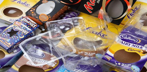Easter Egg packaging includes, a cardboard box, a plastic tray or plastic box and foil.